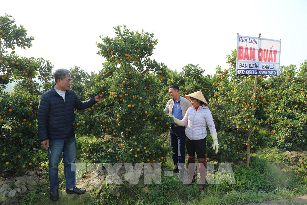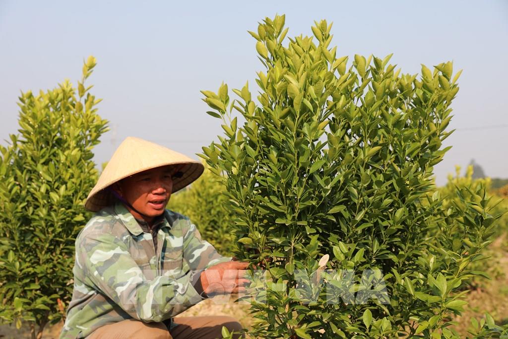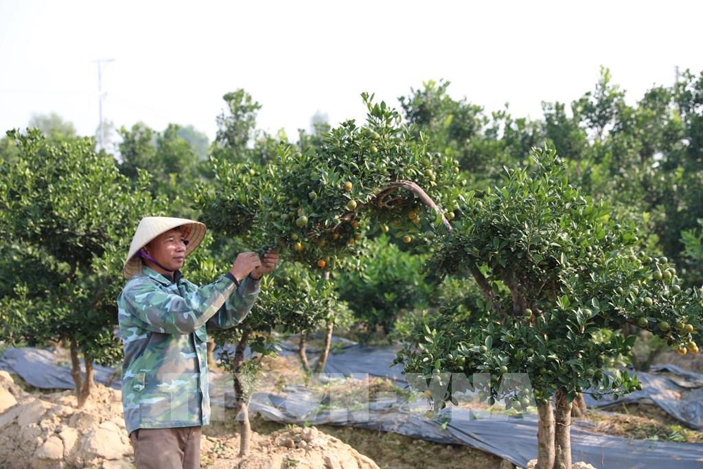 Chăm sóc vườn quất tại xã Hợp Tiến, chuẩn bị cung ứng cho thị trường Tết. Ảnh: Khiếu Tư - TTXVN