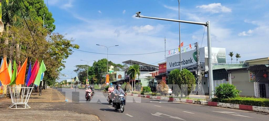 Hệ thống camera phạt nguội được lắp đặt tại nút giao thông Hùng Vương và Trần Phú trên địa bàn xã Ia Grai, tỉnh Gia Lai. Ảnh: Hoài Nam - TTXVN