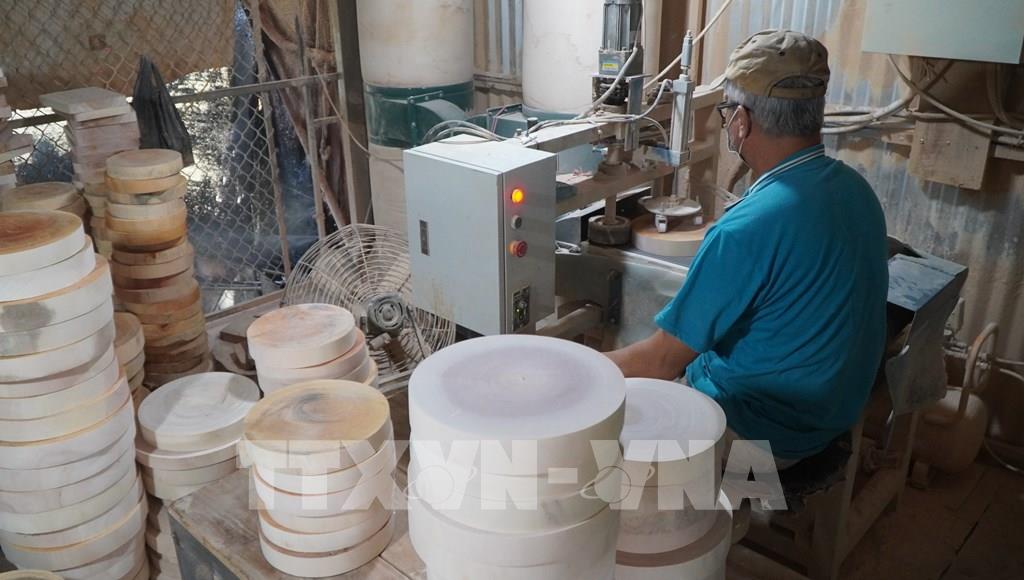 Để có tấm thớt gỗ bán cho khách hàng phải qua nhiều công đoạn như: đi đốn cây, cắt thớt, phơi nắng, gọt láng, bào mặt… Ảnh: Nhựt An - TTXVN