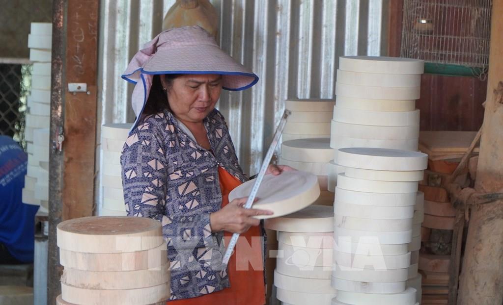 Bà Lê Thị Khen ở ấp An Hòa, xã Lai Vung kiểm tra chất lượng sản phẩm thớt gỗ trước khi xuất bán. Ảnh: Nhựt An - TTXVN