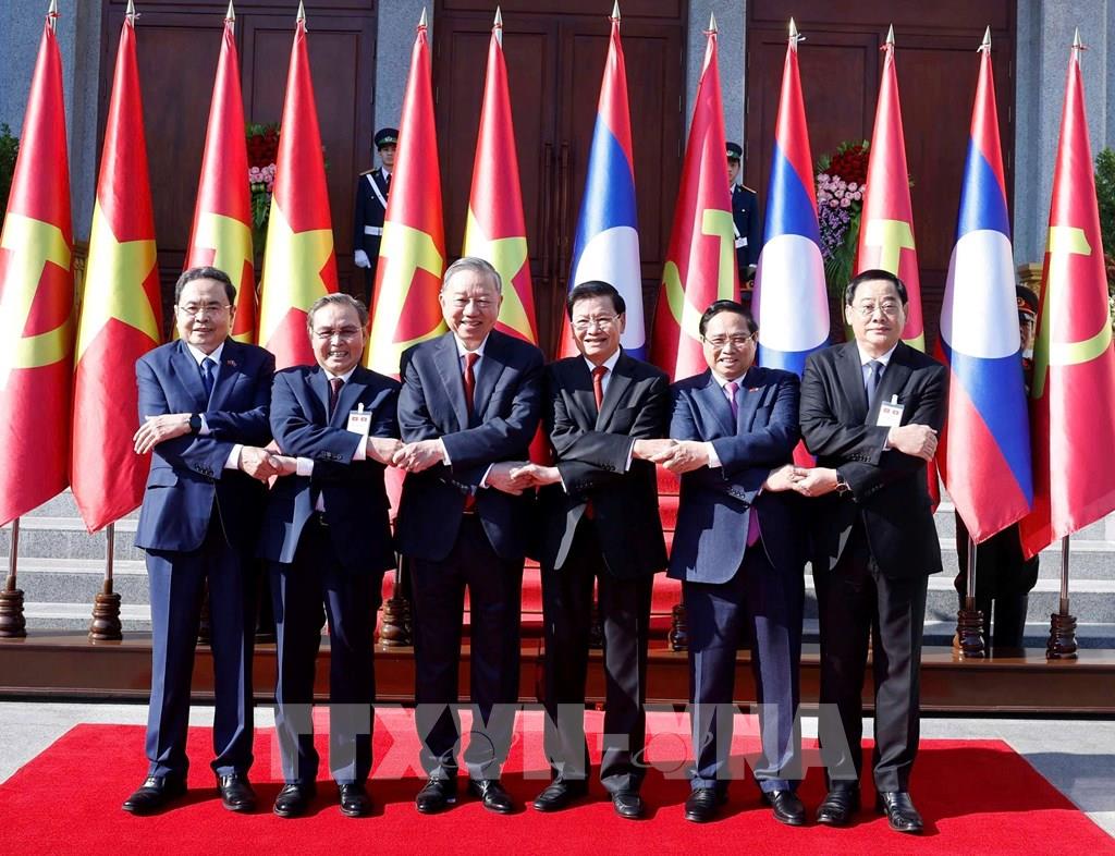 Tổng Bí thư Tô Lâm và Tổng Bí thư, Chủ tịch nước Lào Thongloun Sisoulith cùng các đồng chí Lãnh đạo chủ chốt hai nước. Ảnh: Thống Nhất - TTXVN