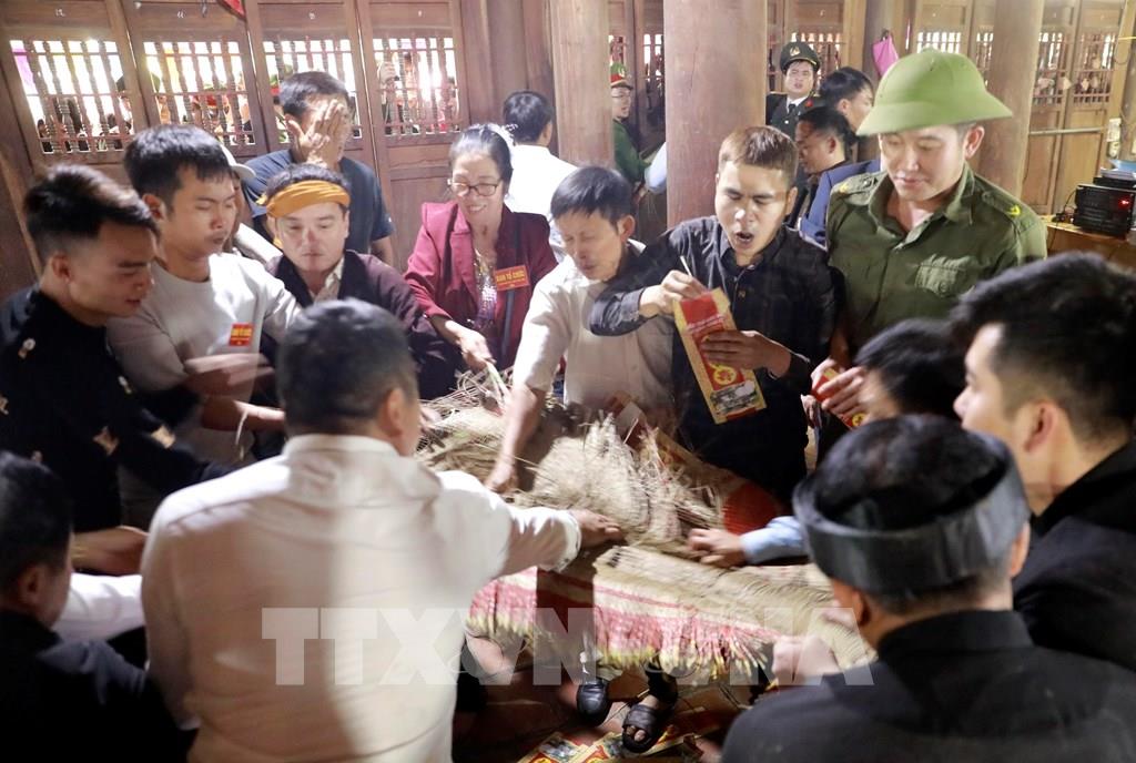 Ban tổ chức "xé chiếu" thánh để phát lộc đầu xuân cho người dân và du khách. Ảnh: Hoàng Hùng - TTXVN