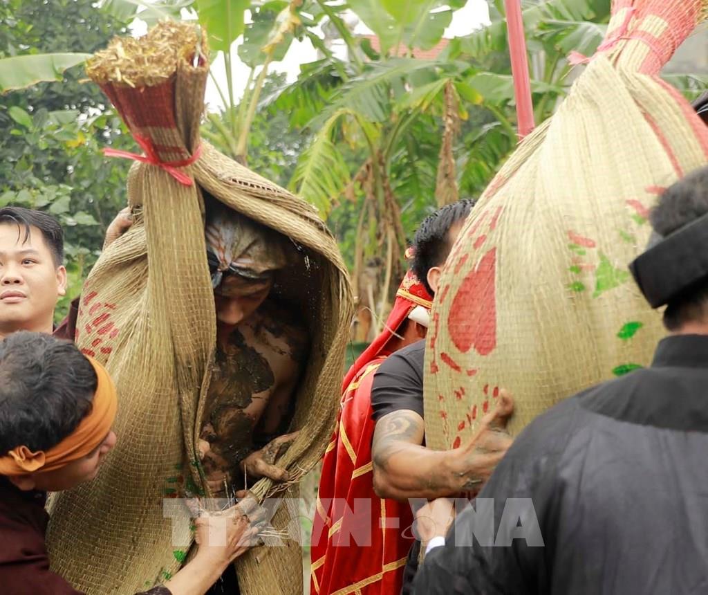Sau khi thực hiện nghi thức trát bùn các “Bụt” được đội chiếu thánh và rước về đình làng. Ảnh: Hoàng Hùng - TTXVN
