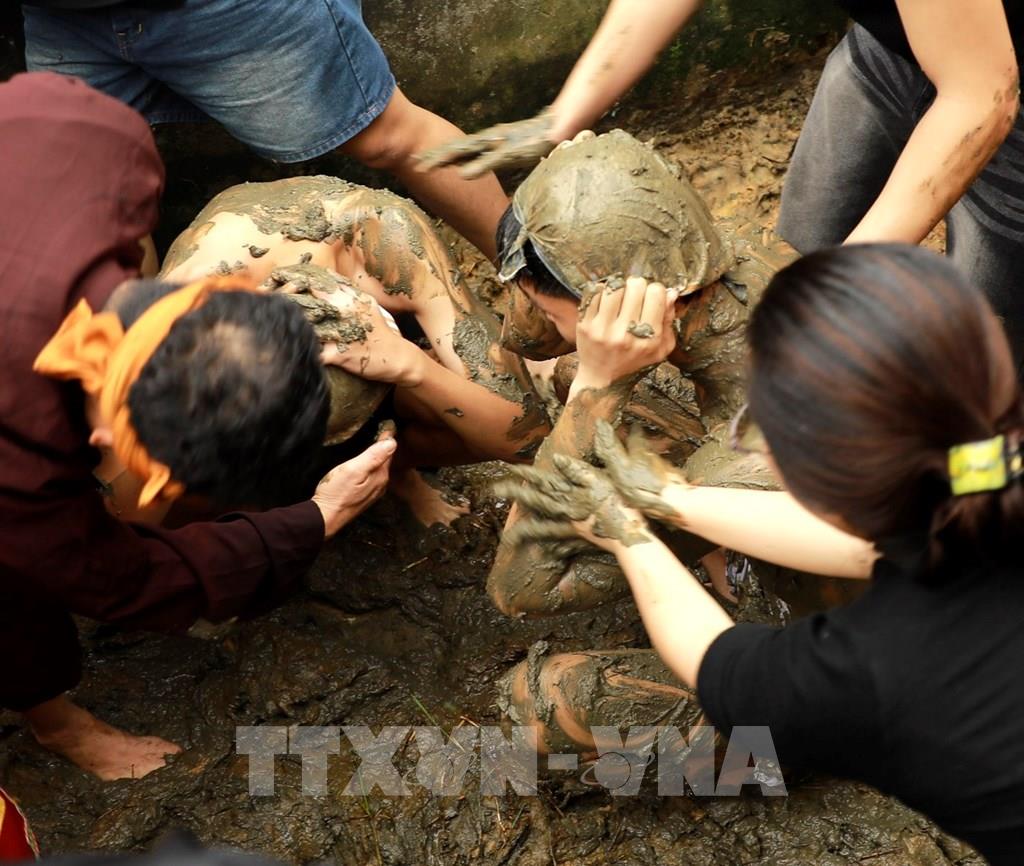 Sau khi tắm, các “Bụt” được rước đi thực hiện nghi thức trát bùn. Ảnh: Hoàng Hùng - TTXVN
