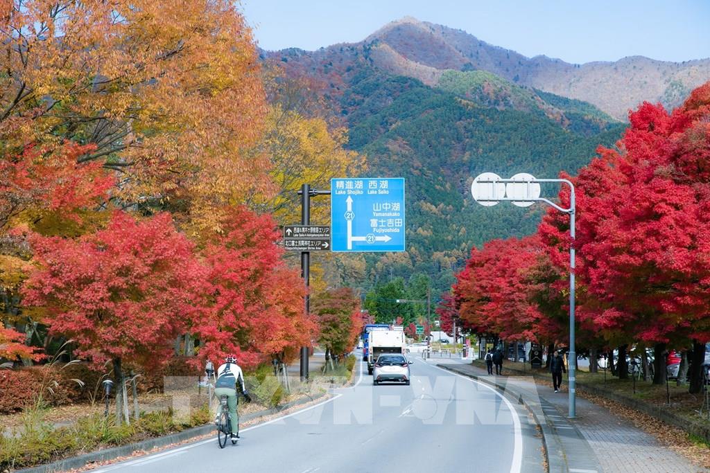 "Đại lộ lá đỏ" rực rỡ ven hồ Kawaguchi. Ảnh: Xuân Giao - PV TTXVN tại Nhật Bản