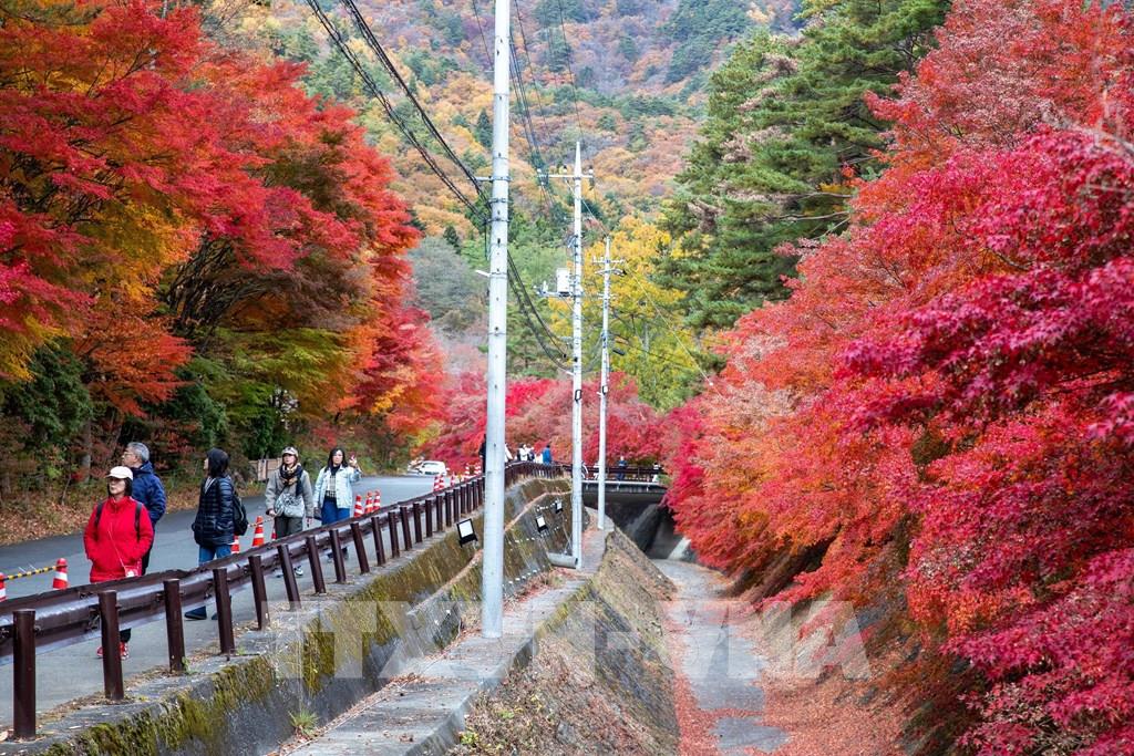 Hàng phong đỏ rực tại Momiji Corridor tạo nên khung cảnh mùa Thu quyến rũ. Ảnh: Xuân Giao - PV TTXVN tại Nhật Bản