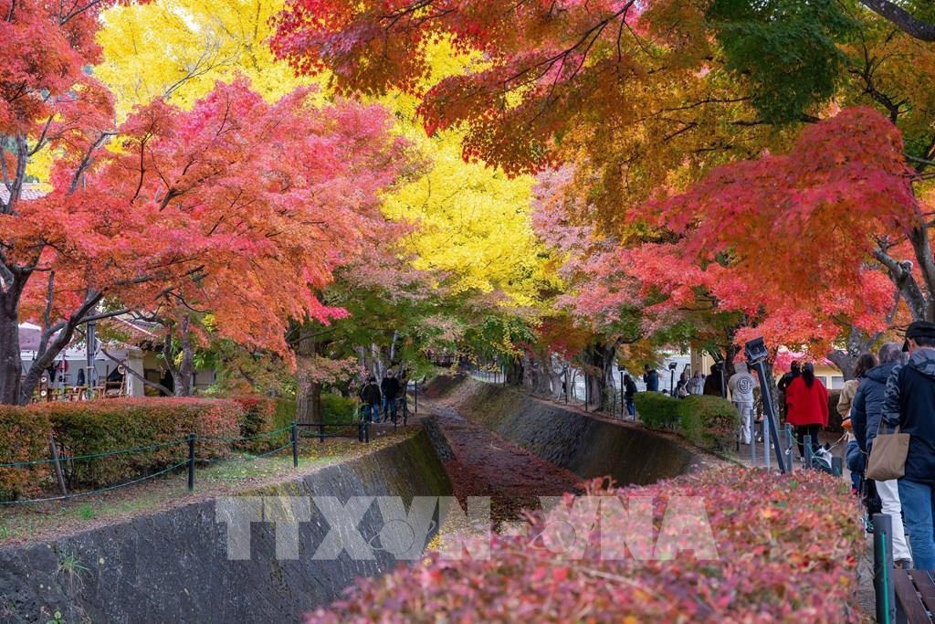 "Hành lang lá đỏ" - con đường dài rợp bóng hàng trăm cây phong chạy dọc theo một kênh nước dẫn ra hồ Kawaguchi. Ảnh: Xuân Giao - PV TTXVN tại Nhật Bản