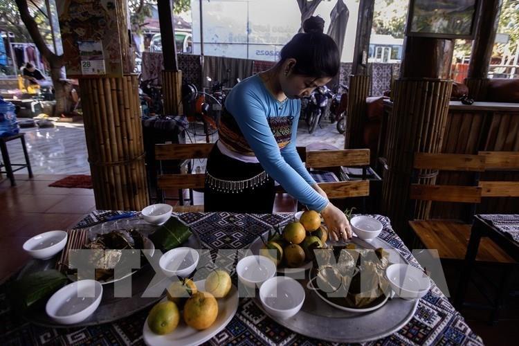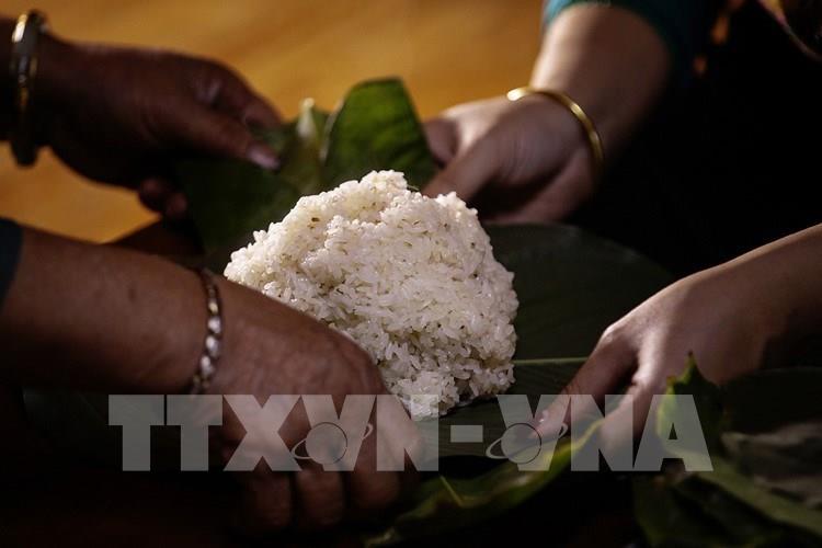 Phụ nữ Thái gói xôi để chuẩn bị dâng lễ. Ảnh: Trọng Đạt - TTXVN
