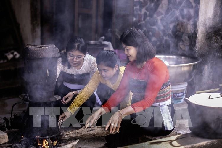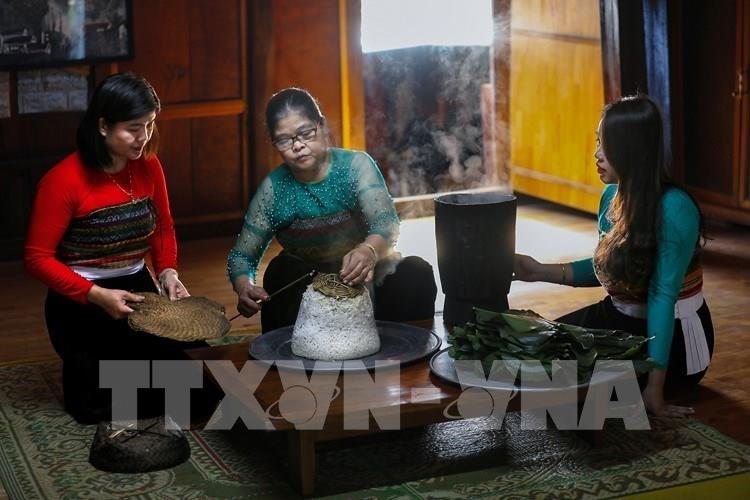 Khi lúa bắt đầu vào độ chín vàng, người phụ nữ Thái sẽ chọn những bông lúa đẹp nhất ở thửa ruộng tốt nhất, mang về treo gác bếp. Khi mùa màng gặt xong, họ mới đạp thóc, giã gạo, đồ xôi để làm lễ. Ảnh: Trọng Đạt - TTXVN