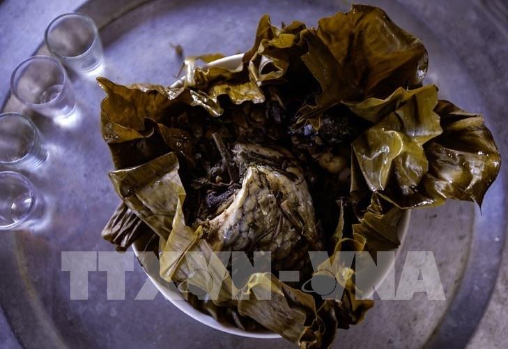 Cá hấp được gói trong lá dong, buộc lạt giang, hấp trong khoảng một giờ – món ăn đặc trưng của người Thái. Ảnh: Trọng Đạt - TTXVN