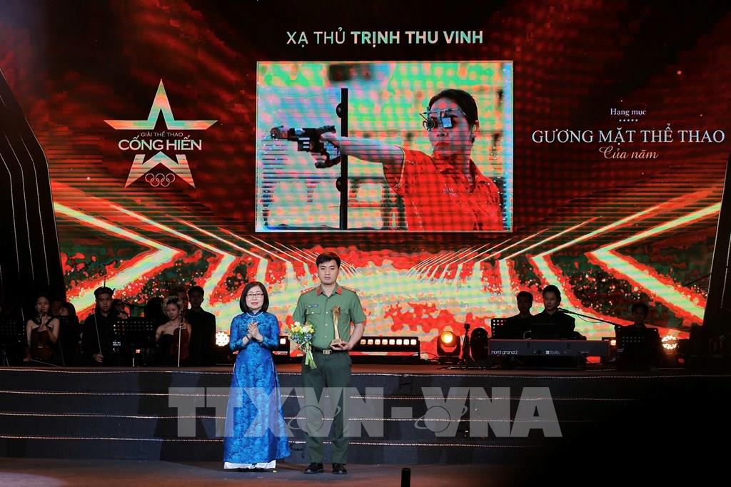 Phó Tổng Giám đốc TTXVN Đoàn Thị Tuyết Nhung trao giải hạng mục Gương mặt thể thao của năm cho VĐV xạ thủ Trịnh Thu Vinh. Ảnh: Hoàng Hiếu - TTXVN
