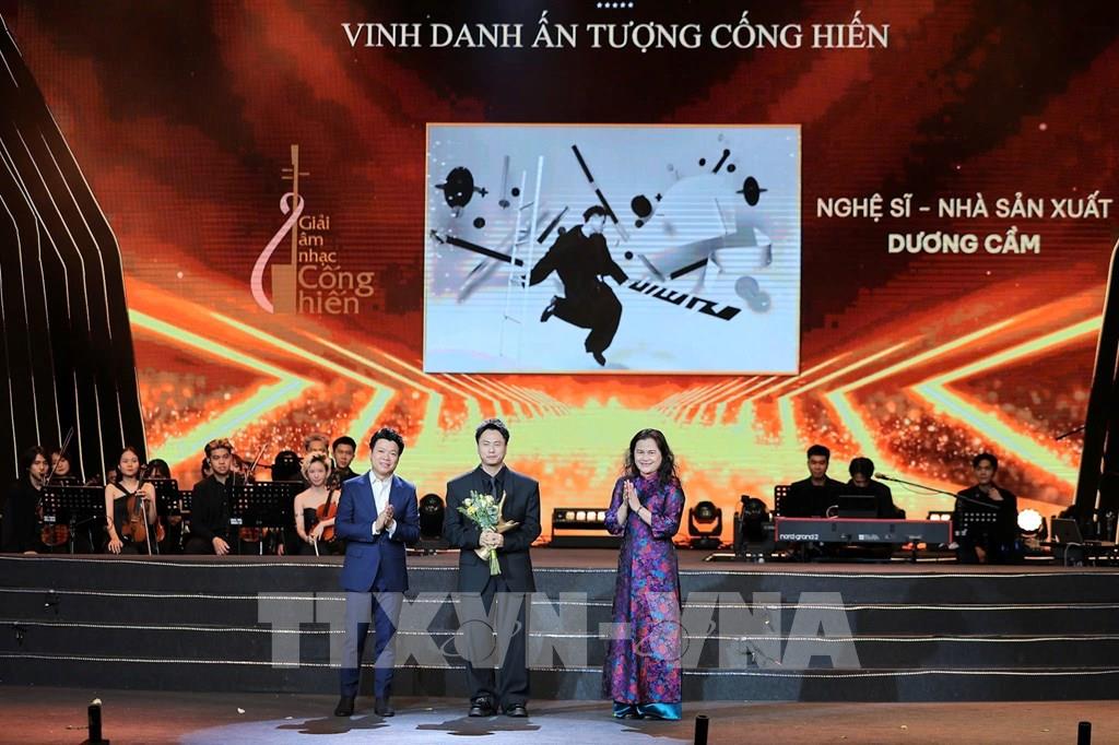 Nhà báo Nguyễn Thị Sự, Phó Tổng giám đốc Thông tấn xã Việt Nam và Trung tá, NSƯT Vũ Thắng Lợi, Phó Giám đốc Dàn nhạc Giao hưởng Quân đội vinh danh Nhạc sĩ Dương Cầm, người kể chuyện văn hóa bằng Nhạc kịch Made in Việt Nam – Nhạc sĩ Dương Cầm. Ảnh: Lê Đông - TTXVN