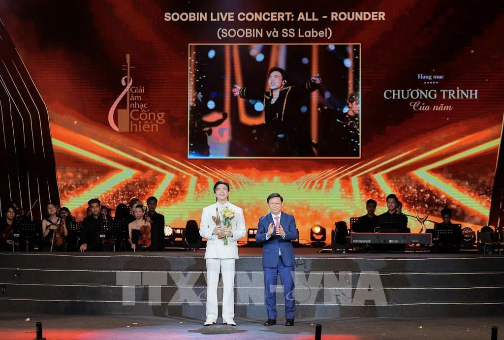 Ông Trần Thanh Lâm, Uỷ viên Trung ương Đảng, Phó Ban Tuyên giáo và Dân vận Trung ương công bố và trao giải cho hạng mục: Chương trình của năm! thuộc về SOOBIN LIVE CONCERT: ALL - ROUNDER (SOOBIN và SS Label). Ảnh: Lê Đông - TTXVN