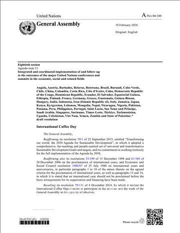 Ngày 10/3 tại New York, Đại hội đồng Liên hợp quốc (LHQ) đã thông qua Nghị quyết A/Res/80/249 lấy ngày 1/10 hàng năm làm “Ngày quốc tế Cà phê” nhằm nâng cao nhận thức của cộng đồng quốc tế về ý nghĩa kinh tế, xã hội và văn hóa của cà phê cũng như vai trò của ngành cà phê đối với phát triển bền vững.