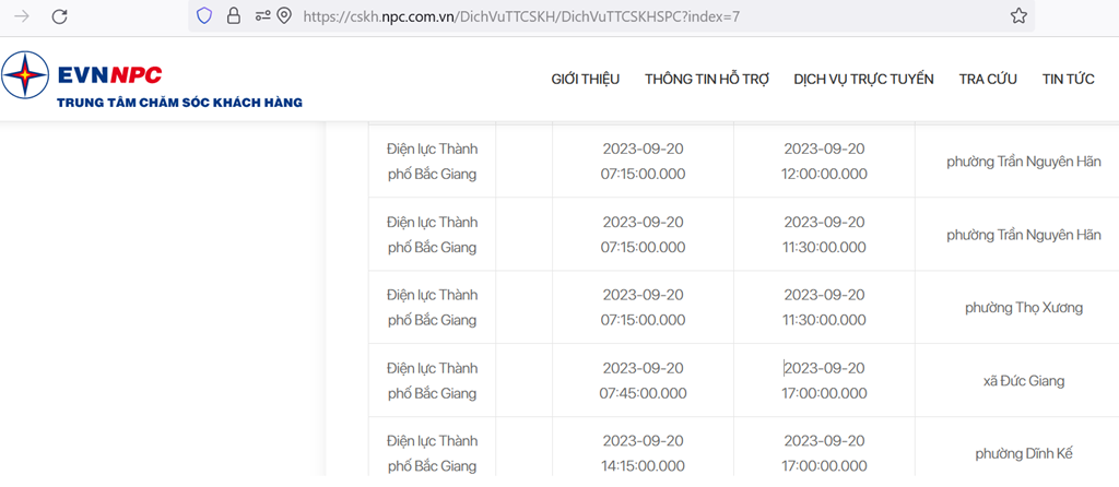 | Điện lực Thành phố Bắc Giang | 2023-09-20 07:15:00.000 | 2023-09-20 12:00:00.000 | phường Trần Nguyên Hãn |