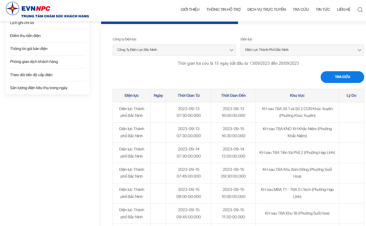 | Điện lực Từ Sơn | 2023-09-15 15:30:00 | 2023-09-15 16:30:00 | Một phần P.Tam Sơn - TP Từ Sơn |