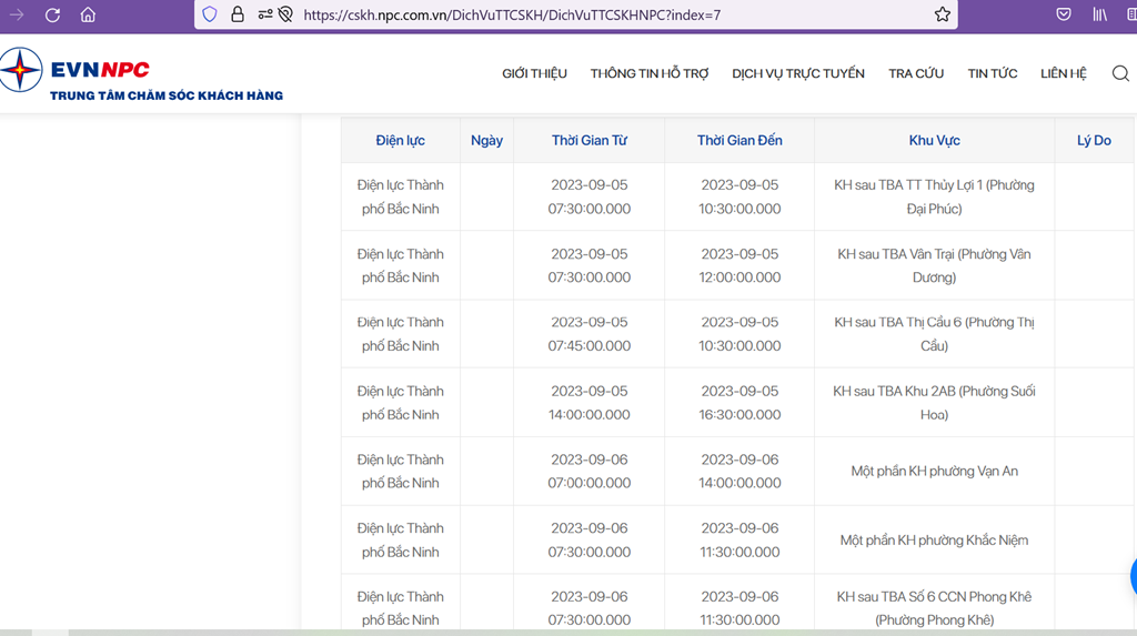 Lịch cắt điện Bắc Ninh ngày mai 5/9 cập nhật ngày 4/98 tại website của EVNNPC. Ảnh: BNEWS phát