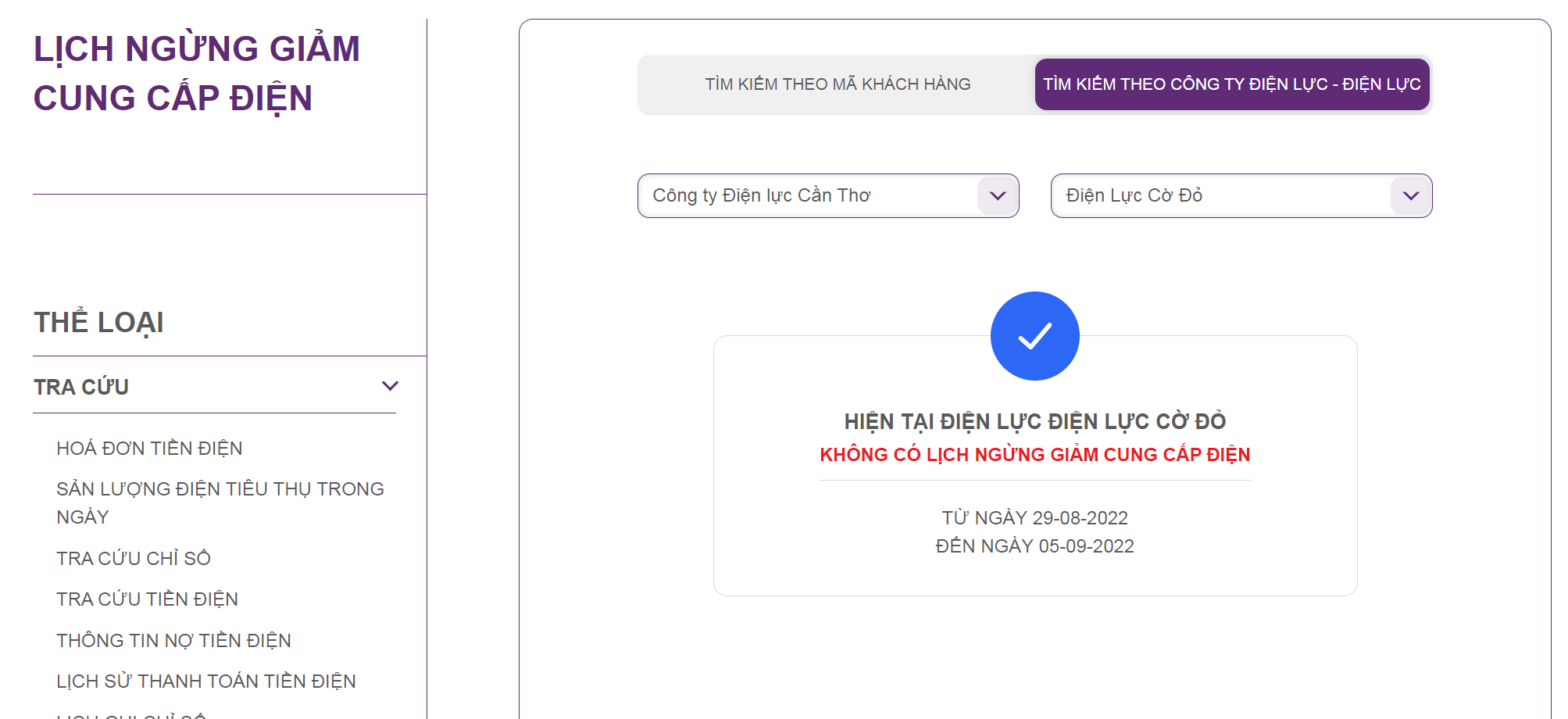 Lịch ngừng cấp điện trên địa bàn Cần Thơ ngày mai 1/9 được cập nhật vào 8h56 ngày 31/8 tại website của EVNSPC. Ảnh: BNEWS