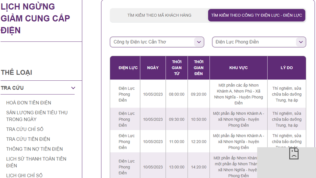 | Điện Lực Phong Điền | 10/05/2023 | 13:00:00 | 14:20:00 | Một phần ấp Nhơn Khánh A; một phần ấp Nhơn Thành - xã Nhơn Nghĩa - huyện Phong Điền | Thí nghiệm, sửa chữa bảo dưỡng Trung, hạ áp |