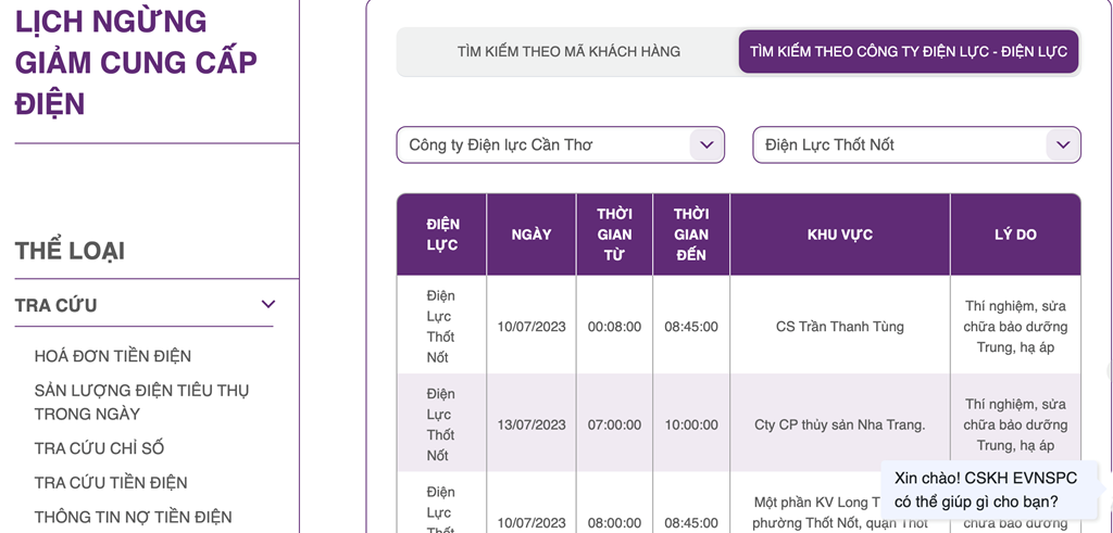 | Điện Lực Thốt Nốt | 10/07/2023 | 09:00:00 | 09:45:00 | CS NTTS Lê Thanh Hải | Thí nghiệm, sửa chữa bảo dưỡng Trung, hạ áp |