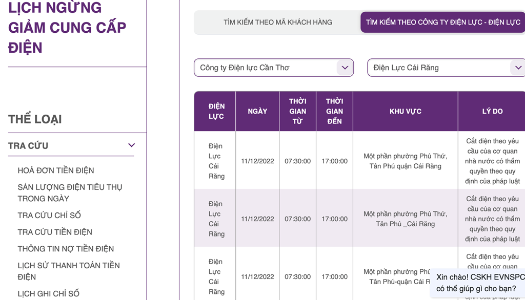 Lịch ngừng cấp điện trên địa bàn Cần Thơ ngày mai 10/12 được cập nhật lúc 8h45 ngày 9/12 tại website của EVNSPC.