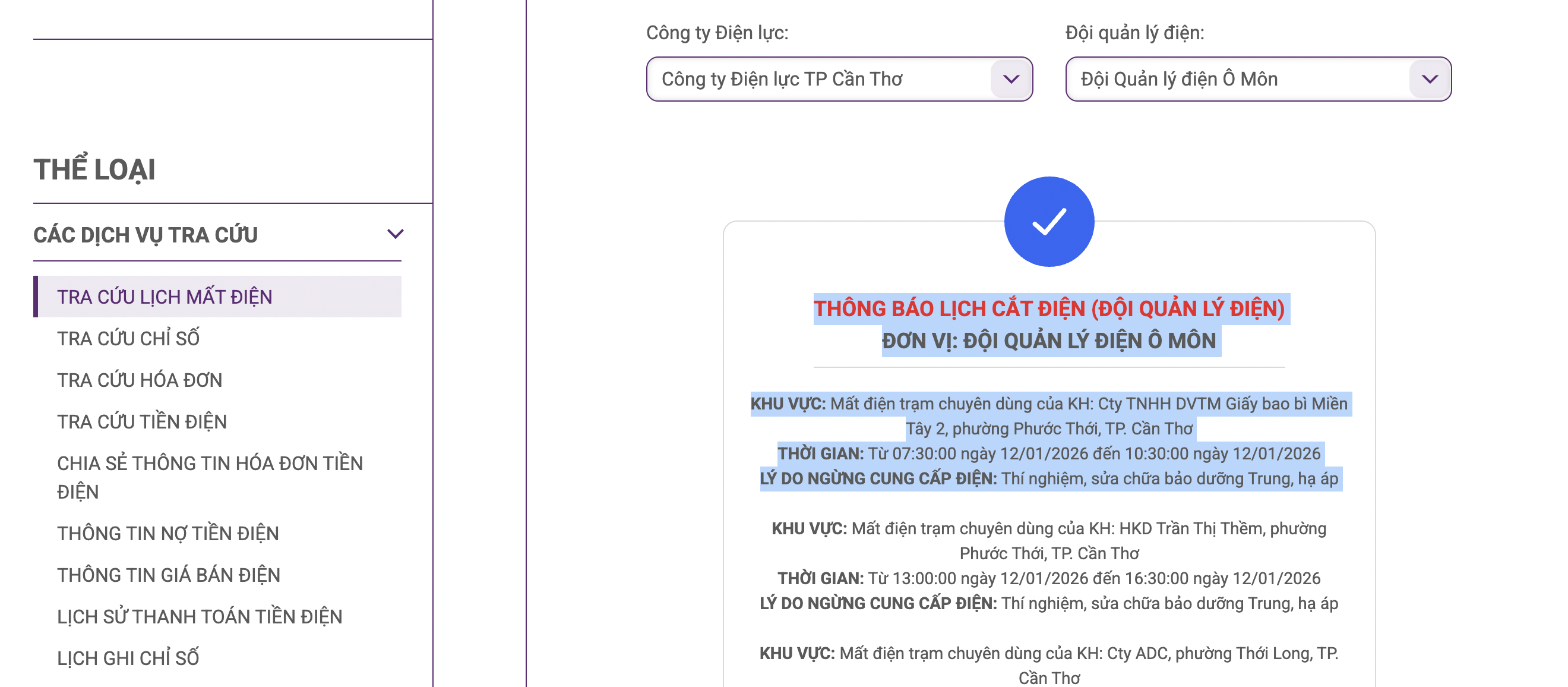 Công ty Điện lực thành phố Cần Thơ thông báo lịch cắt điện ngày mai 12/1 tại các xã, phường trên địa bàn thành phố Cần Thơ trên website của Tổng Công ty Điện lực miền Nam như sau: