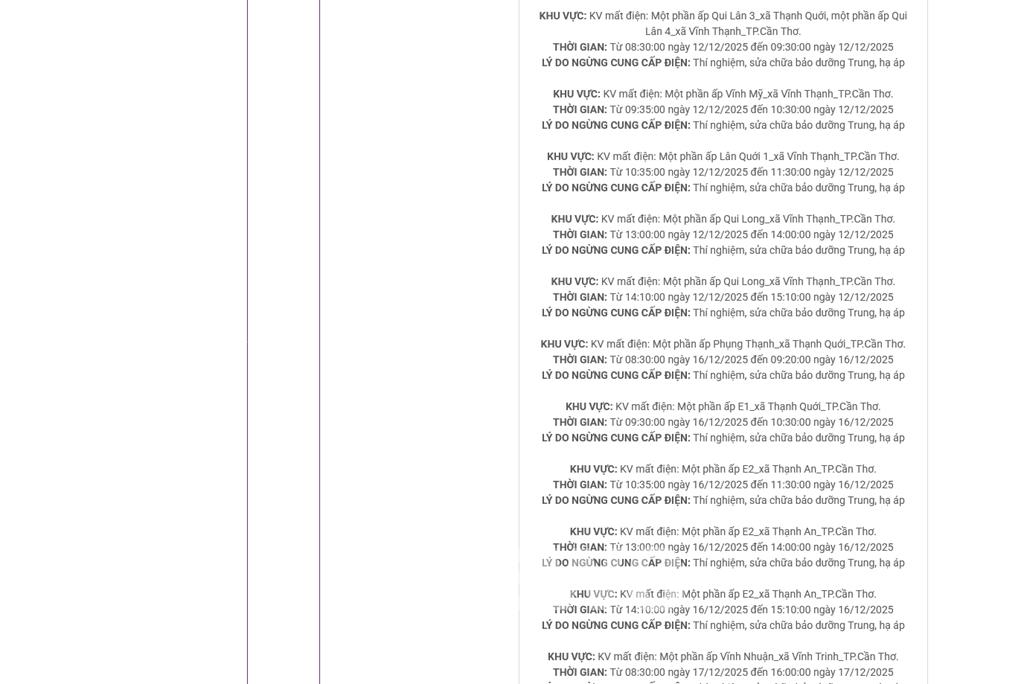 Lịch cắt điện Cần Thơ ngày mai 12/12 cập nhật mới nhất. Nguồn ảnh: PC Cần Thơ