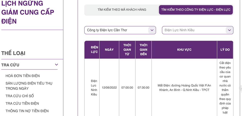 Để cập nhật lịch cắt điện Cần Thơ, người dân có thể truy cập: https://cskh.evnspc.vn/TraCuu/LichNgungGiamCungCapDien