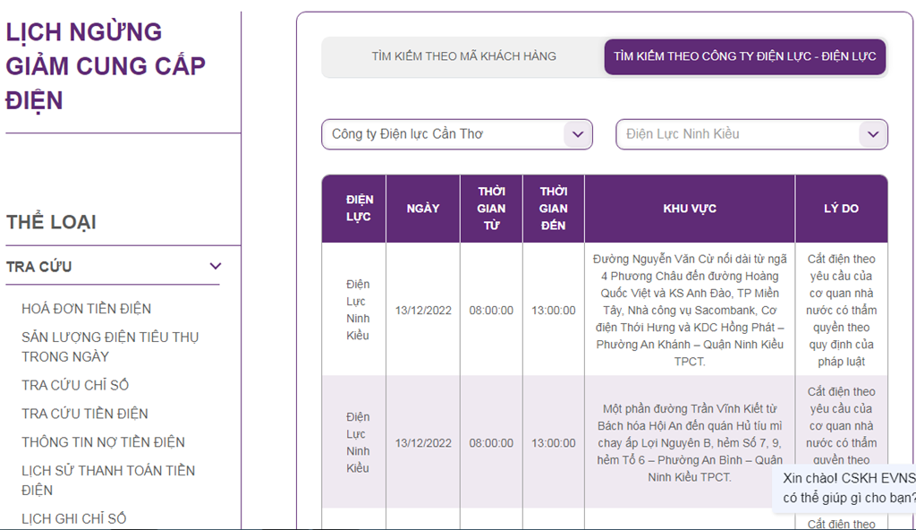 Lịch cắt điện Cần Thơ ngày 13/12 cập nhật tại website EVNSPC. Ảnh: BNEWS