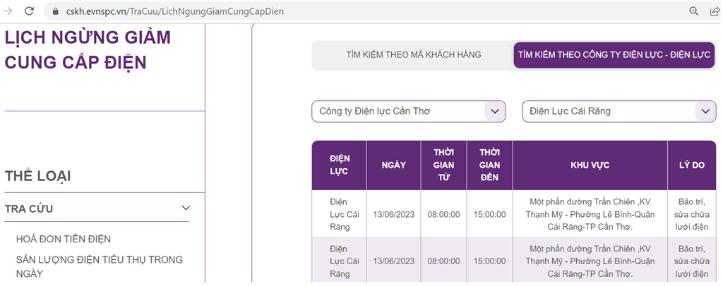 | Điện Lực Cái Răng | 13/06/2023 | 08:00:00 | 15:00:00 | Một phần đường Trần Chiên ,KV Thạnh Mỹ - Phường Lê Bình-Quận Cái Răng-TP Cần Thơ. | Bảo trì, sửa chữa lưới điện |