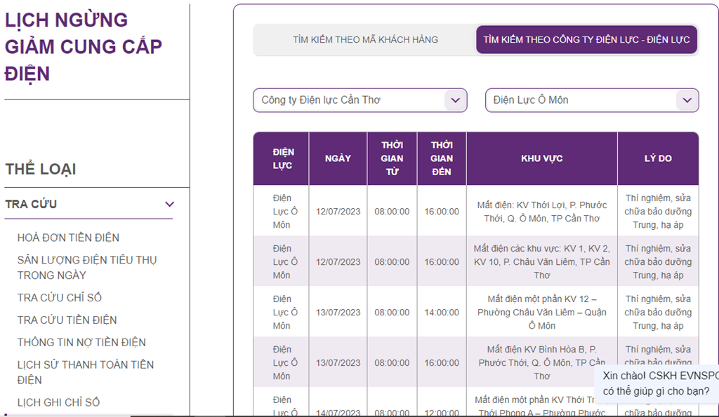 Lịch cắt điện Cần Thơ ngày 13/7 cập nhật tại website của EVNSPC. Ảnh: BNEWS