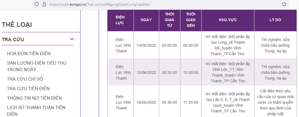 Lịch ngừng cấp điện trên địa bàn Cần Thơ ngày mai 13/6 được cập nhật lúc 7h40 ngày 12/6 tại website của EVNSPC.