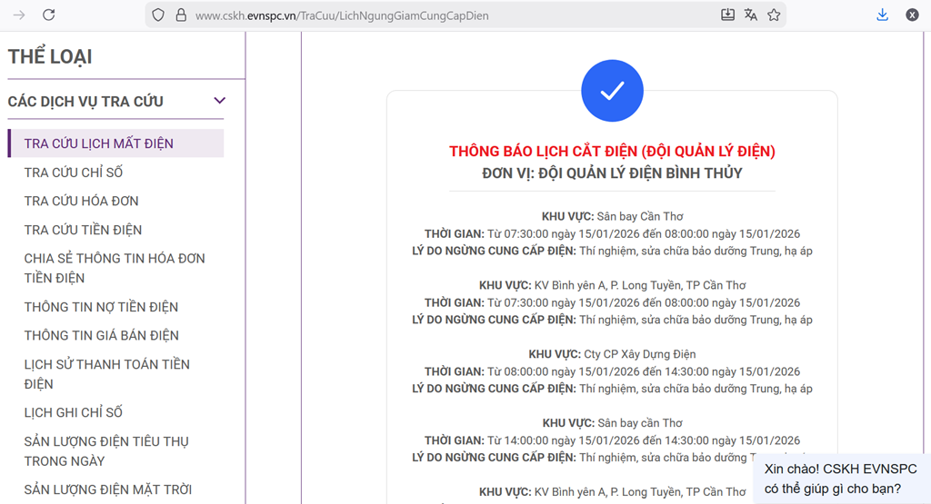 Công ty Điện lực thành phố Cần Thơ thông báo lịch cắt điện ngày mai 15/1 tại các xã, phường trên địa bàn thành phố Cần Thơ trên website của Tổng Công ty Điện lực miền Nam như sau.
