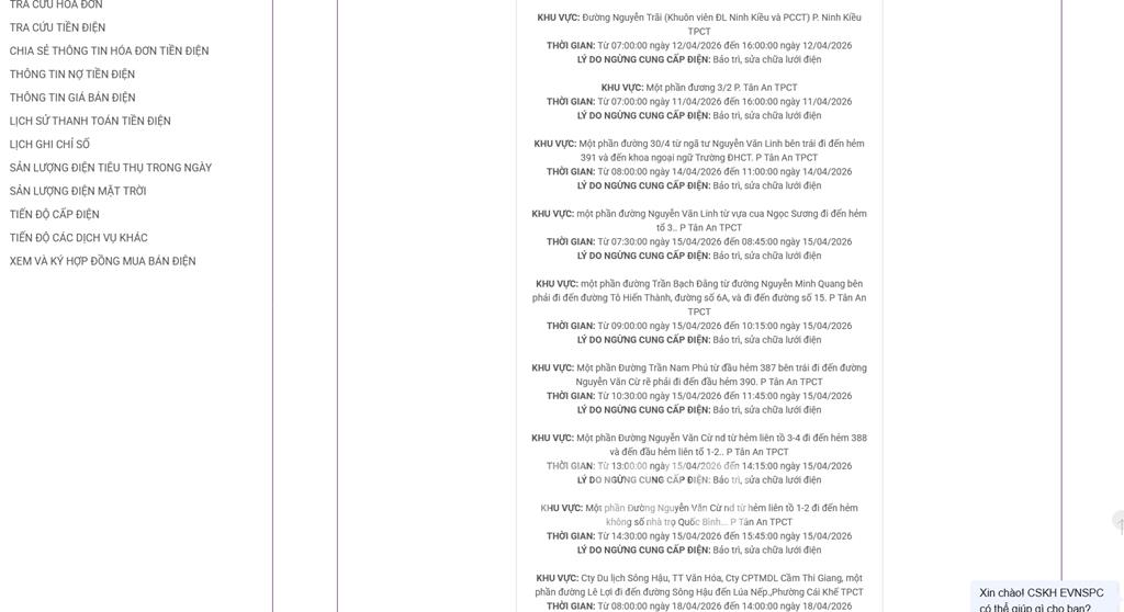 THỜI GIAN: Từ 07:30:00 ngày 15/04/2026 đến 08:45:00 ngày 15/04/2026LÝ DO NGỪNG CUNG CẤP ĐIỆN: Bảo trì, sửa chữa lưới điệnKHU VỰC: một phần đường Trần Bạch Đằng từ đường Nguyễn Minh Quang bên phải đi đến đường Tô Hiến Thành, đường số 6A, và đi đến đường số 15. P Tân An TPCTTHỜI GIAN: Từ 09:00:00 ngày 15/04/2026 đến 10:15:00 ngày 15/04/2026LÝ DO NGỪNG CUNG CẤP ĐIỆN: Bảo trì, sửa chữa lưới điệnKHU VỰC: Một phần Đường Trần Nam Phú từ đầu hẻm 387 bên trái đi đến đường Nguyễn Văn Cừ rẽ phải đi đến đầu hẻm 390. P Tân An TPCTTHỜI GIAN: Từ 10:30:00 ngày 15/04/2026 đến 11:45:00 ngày 15/04/2026LÝ DO NGỪNG CUNG CẤP ĐIỆN: Bảo trì, sửa chữa lưới điệnKHU VỰC: Một phần Đường Nguyễn Văn Cừ nd từ hẻm liên tồ 3-4 đi đến hẻm 388 và đến đầu hẻm liên tổ 1-2.. P Tân An TPCTTHỜI GIAN: Từ 13:00:00 ngày 15/04/2026 đến 14:15:00 ngày 15/04/2026LÝ DO NGỪNG CUNG CẤP ĐIỆN: Bảo trì, sửa chữa lưới điệnKHU VỰC: Một phần Đường Nguyễn Văn Cừ nd từ hẻm liên tồ 1-2 đi đến hẻm không số nhà trọ Quốc Bình... P Tân An TPCTTHỜI GIAN: Từ 14:30:00 ngày 15/04/2026 đến 15:45:00 ngày 15/04/2026LÝ DO NGỪNG CUNG CẤP ĐIỆN: Bảo trì, sửa chữa lưới điệnKHU VỰC: Một phần KV 1 đến Cầu Hưng Lợi - P. Cái Răng - TP Cần ThơTHỜI GIAN: Từ 07:30:00 ngày 15/04/2026 đến 11:30:00 ngày 15/04/2026LÝ DO NGỪNG CUNG CẤP ĐIỆN: Thí nghiệm, sửa chữa bảo dưỡng Trung, hạ ápKHU VỰC: Một phần KV 1 đến Cầu Hưng Lợi - P. Cái Răng - TP Cần ThơTHỜI GIAN: Từ 13:00:00 ngày 15/04/2026 đến 16:30:00 ngày 15/04/2026LÝ DO NGỪNG CUNG CẤP ĐIỆN: Thí nghiệm, sửa chữa bảo dưỡng Trung, hạ áp KHU VỰC: - Một phần khu vực: Mỹ Lộc; Mỹ Thuận; Mỹ Ái – phường An Bình; Bên phải đường Nguyễn Văn Cừ nối dài hướng bên ĐH Nam Cần Thơ thuộc khu vực Mỹ Lộc – Phường An BìnhTHỜI GIAN: Từ 07:00:00 ngày 15/04/2026 đến 11:00:00 ngày 15/04/2026LÝ DO NGỪNG CUNG CẤP ĐIỆN: Bảo trì, sửa chữa lưới điệnKHU VỰC: - Các ấp: Thới An B; Thới An; An Thạnh; Bình Thạnh; Thới Thạnh; Tân Hưng; Thới Hưng; Tân Bình; Bình Xuân; Ba Cao – xã Phong Điền; Khu vực: Mỹ Hòa; Mỹ Phụng – phường An BìnhTHỜI GIAN: Từ 07:00:00 ngày 15/04/2026 đến 07:40:00 ngày 15/04/2026LÝ DO NGỪNG CUNG CẤP ĐIỆN: Bảo trì, sửa chữa lưới điệnKHU VỰC: - Các ấp: Thới An B; Thới An; An Thạnh; Bình Thạnh; Thới Thạnh; Tân Hưng; Thới Hưng; Tân Bình; Bình Xuân; Ba Cao – xã Phong Điền; Khu vực: Mỹ Hòa; Mỹ Phụng – phường An BìnhTHỜI GIAN: Từ 10:30:00 ngày 15/04/2026 đến 11:00:00 ngày 15/04/2026LÝ DO NGỪNG CUNG CẤP ĐIỆN: Bảo trì, sửa chữa lưới điện.EVNSPC khuyến cáo người dân sử dụng các thiết bị điện đúng cách, tiết kiệm, hiệu quả để giảm tiêu thụ điện, góp phần giảm chi phí tiền điện sử dụng trong sinh hoạt cuộc sống thường ngày.