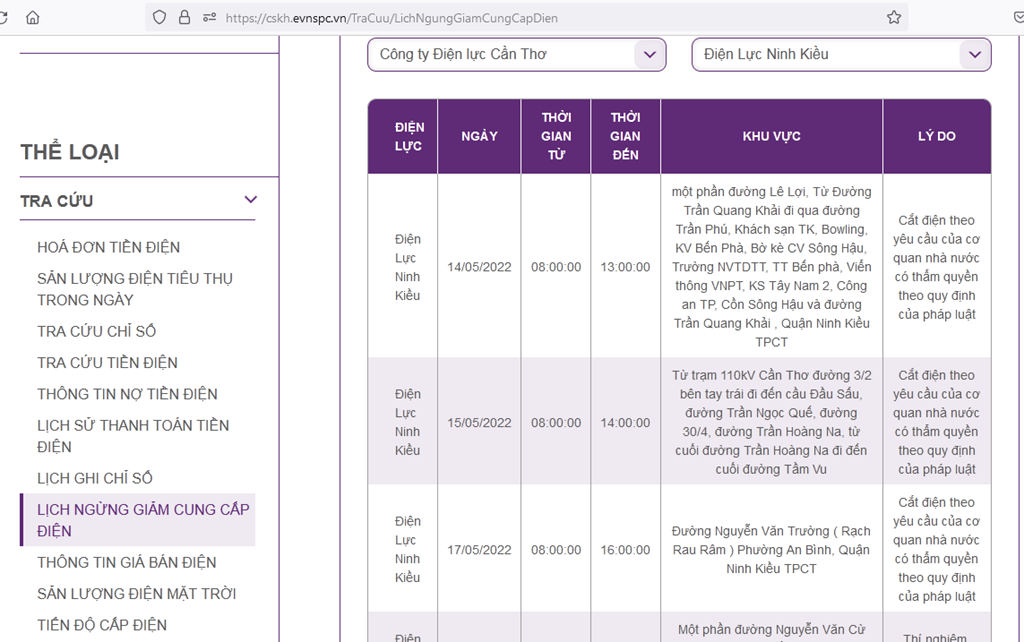 Để cập nhật lịch cắt điện Cần Thơ, người dân có thể truy cập: https://cskh.evnspc.vn/DichVuTTCSKH/DichVuTTCSKHSPC?index=7
