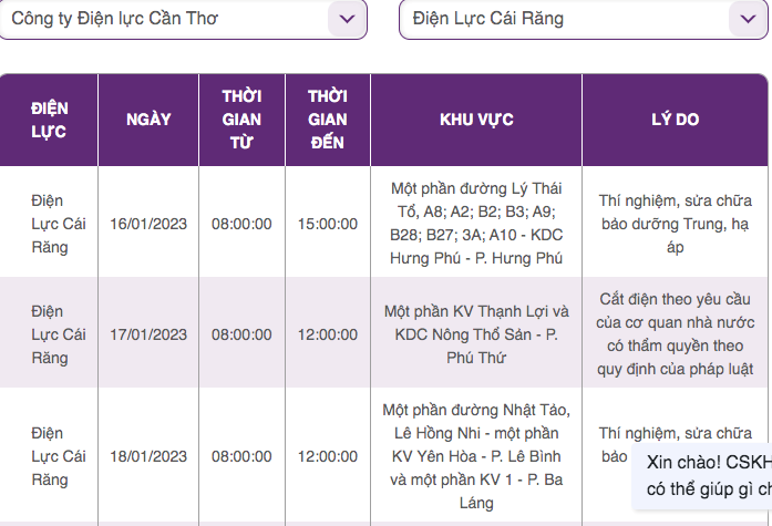 | Điện Lực Cái Răng | 16/01/2023 | 8:00:00 | 15:00:00 | Một phần đường Lý Thái Tổ, A8; A2; B2; B3; A9; B28; B27; 3A; A10 - KDC Hưng Phú - P. Hưng Phú | Thí nghiệm, sửa chữa bảo dưỡng Trung, hạ áp |