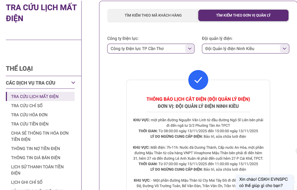 Lịch cắt điện tại các khu vực trên địa bàn Cần Thơ ngày mai 14/11 được cập nhật tại website của Tổng công ty Điện lực miền Nam (EVNSPC).