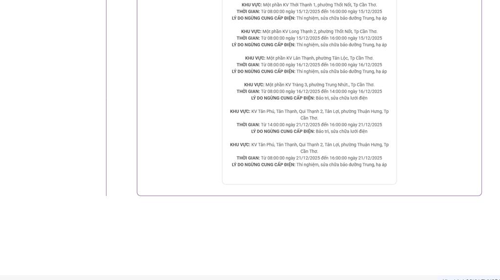 Lịch cắt điện Cần Thơ ngày mai 16/12 cập nhật mới nhất. Nguồn ảnh: PC Cần Thơ