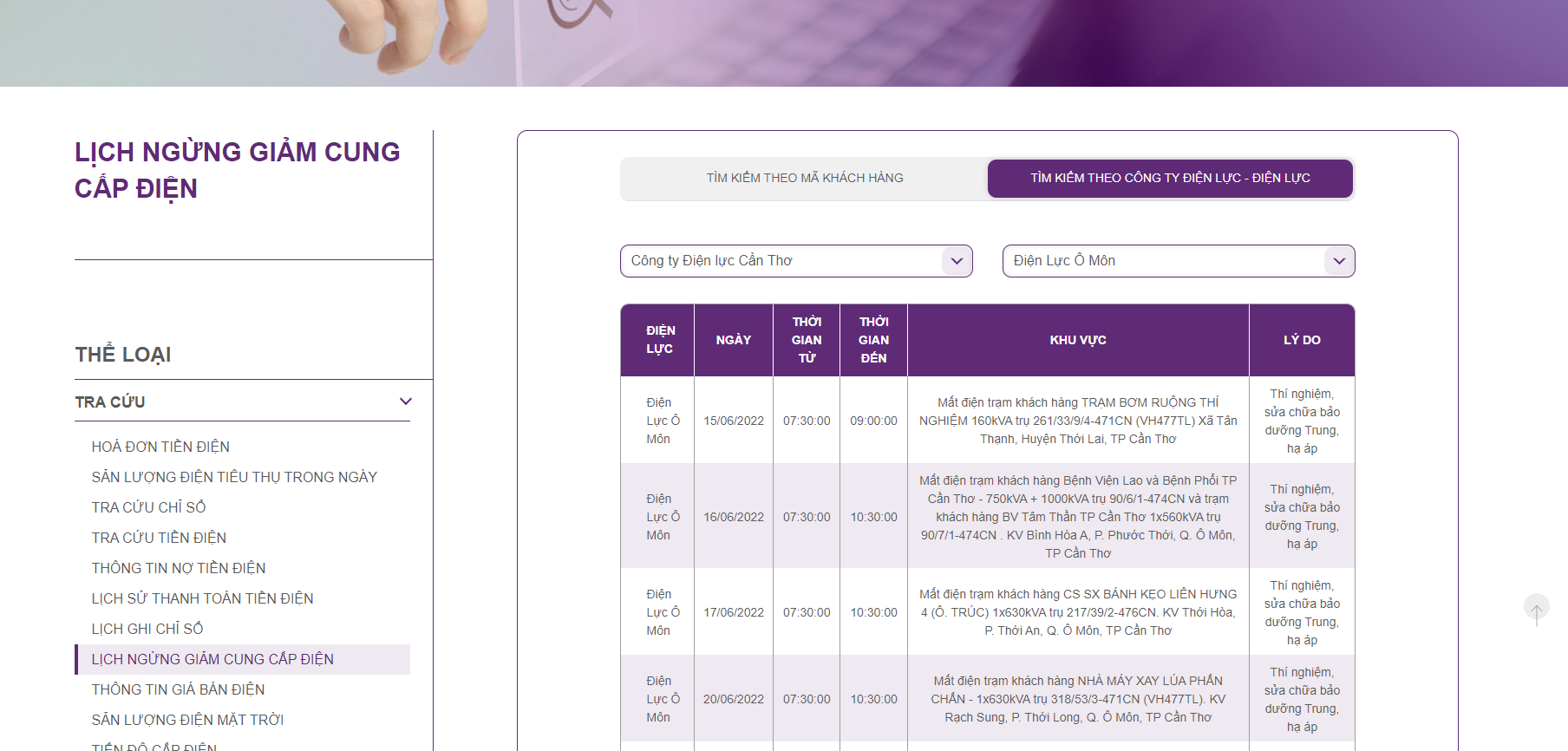 | Điện Lực Ô Môn | 16/06/2022 | 13:30:00 | 15:00:00 | Mất điện trạm khách hàng CẦU ĐƯỜNG TẤN LỘC - 1x750kVA trụ 116/21A/5-478CN. KV Thới Lợi, Phường Phước Thới, Q. Ô Môn, TP Cần Thơ) | Thí nghiệm, sửa chữa bảo dưỡng Trung, hạ áp |