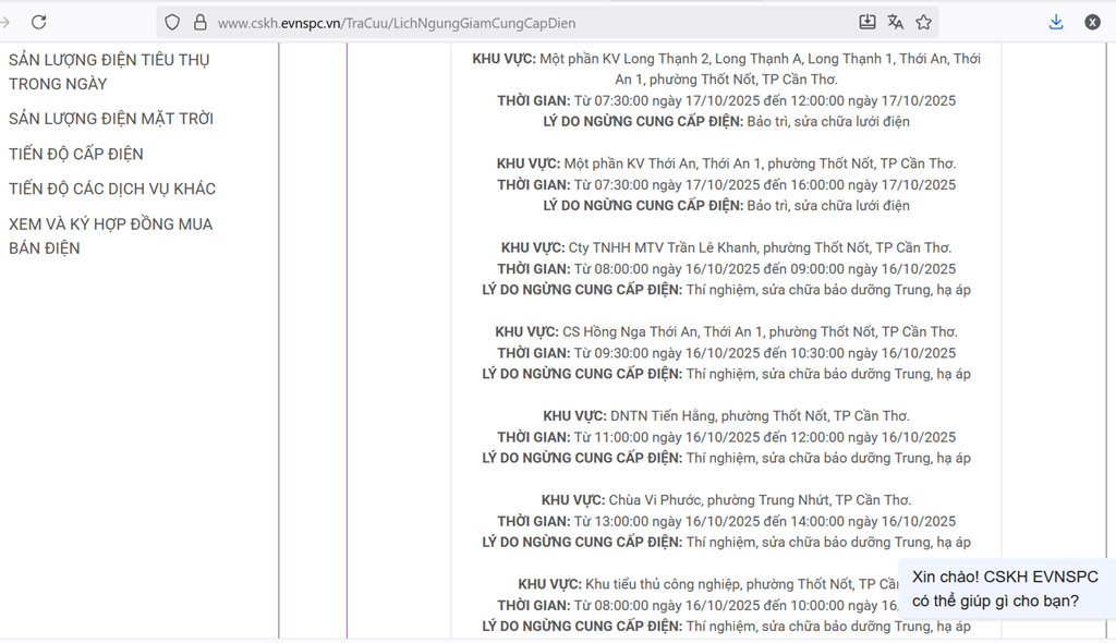 Lịch cắt điện trên địa bàn Cần Thơ ngày mai 17/10 được cập nhật tại website của Tổng công ty Điện lực miền Nam (EVNSPC).