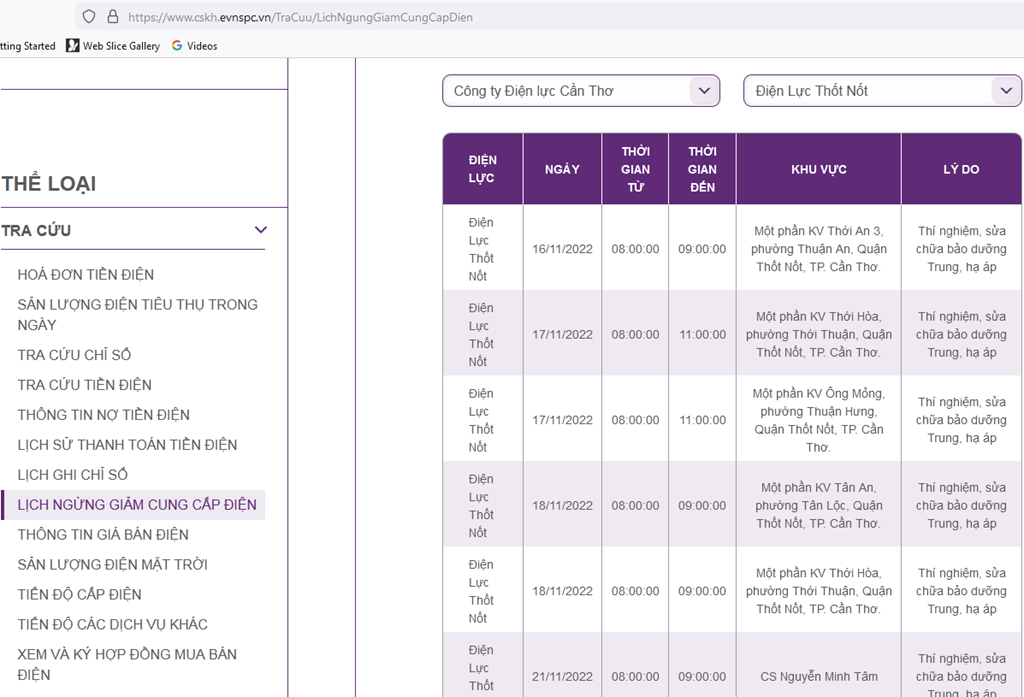 Để cập nhật lịch cắt điện Cần Thơ, người dân có thể truy cập: https://cskh.evnspc.vn/TraCuu/LichNgungGiamCungCapDien