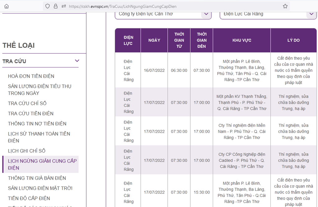 Để cập nhật lịch cắt điện Cần Thơ, người dân có thể truy cập: https://cskh.evnspc.vn/DichVuTTCSKH/DichVuTTCSKHSPC?index=7