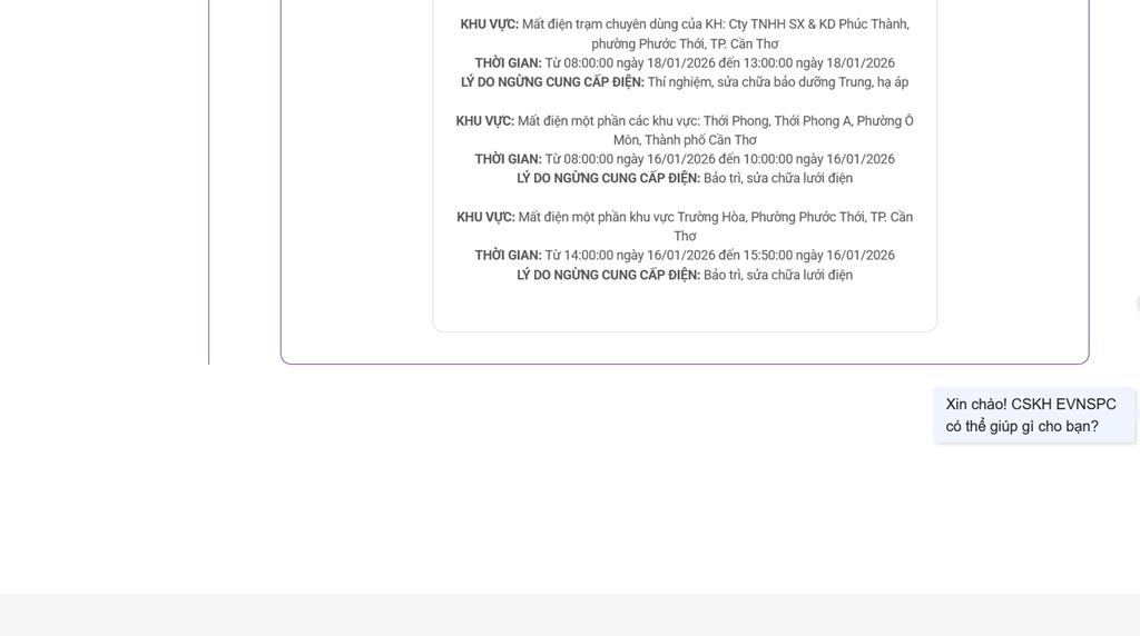 Lịch ngừng cấp điện tại Cần Thơ ngày mai 18/1 được cập nhật ngày 17/1 tại website của EVNSPC. Ảnh: BNEWS phát