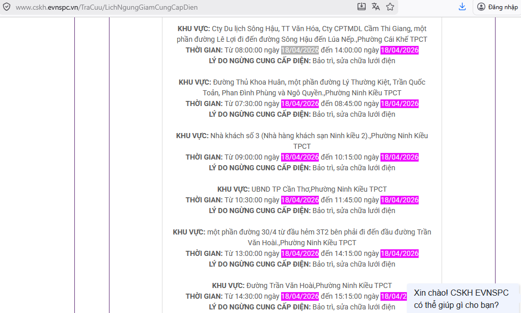 Công ty Điện lực thành phố Cần Thơ thông báo lịch cắt điện ngày mai 18/4 tại các quận, huyện Cần Thơ trên website của Tổng Công ty Điện lực miền Nam như sau.