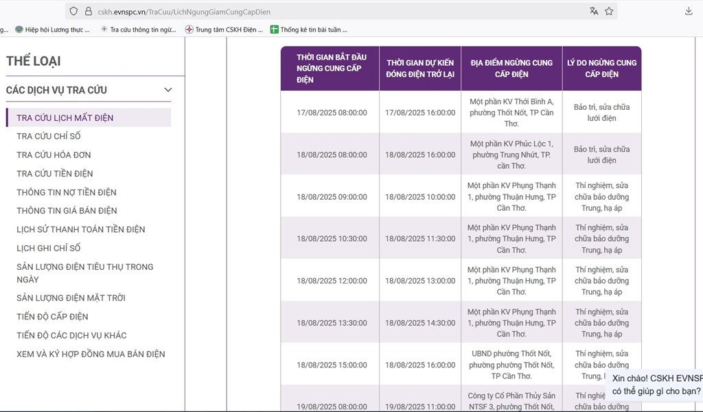 Lịch ngừng cấp điện tại Cần Thơ ngày mai 18/8 được cập nhật ngày 17/8 tại website của EVNSPC. Ảnh: BNEWS phát