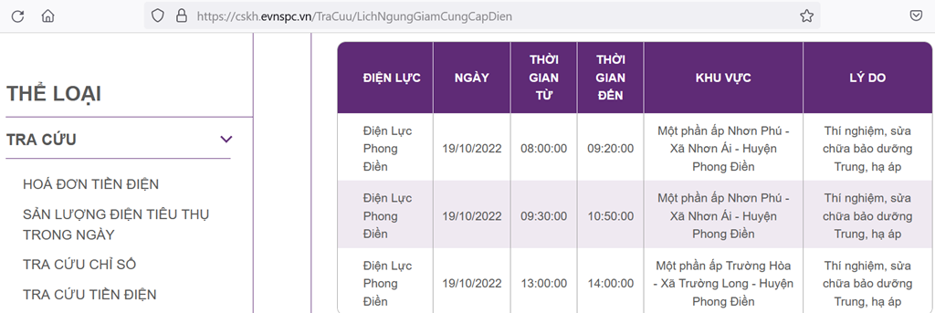 | Điện Lực Thốt Nốt | 19/10/2022 | 08:00:00 | 09:00:00 | Công A n PCCC Quận Thốt Nốt | Thí nghiệm, sửa chữa bảo dưỡng Trung, hạ áp | |||||