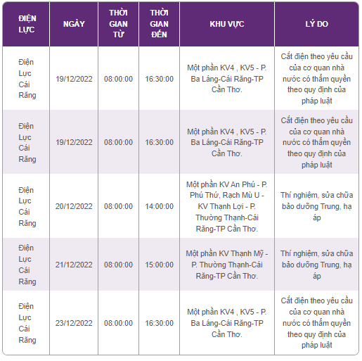 | Điện Lực Cái Răng | 19/12/2022 | 08:00:00 | 16:30:00 | Một phần KV4 , KV5 - P. Ba Láng-Cái Răng-TP Cần Thơ. | Cắt điện theo yêu cầu của cơ quan nhà nước có thẩm quyền theo quy định của pháp luật |