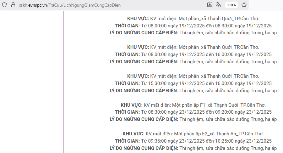 Lịch ngừng cấp điện trên địa bàn Cần Thơ ngày mai 18/12 được cập nhật vào ngày 17/12 tại website của EVNSPC.