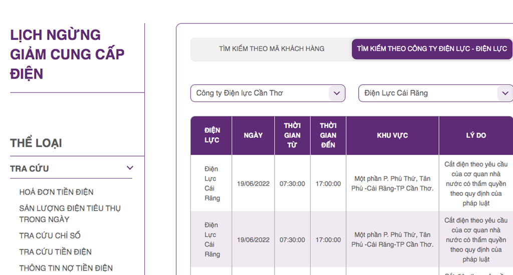 | Điện Lực Cái Răng | 19/06/2022 | 07:30:00 | 17:00:00 | Một phần P. Phú Thứ, Tân Phú -Cái Răng-TP Cần Thơ. | Cắt điện theo yêu cầu của cơ quan nhà nước có thẩm quyền theo quy định của pháp luật |