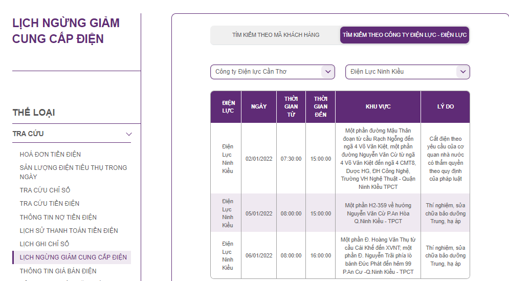 Để cập nhật lịch cắt điện Cần Thơ, người dân có thể truy cập: https://cskh.evnspc.vn/TraCuu/LichNgungGiamCungCapDien
